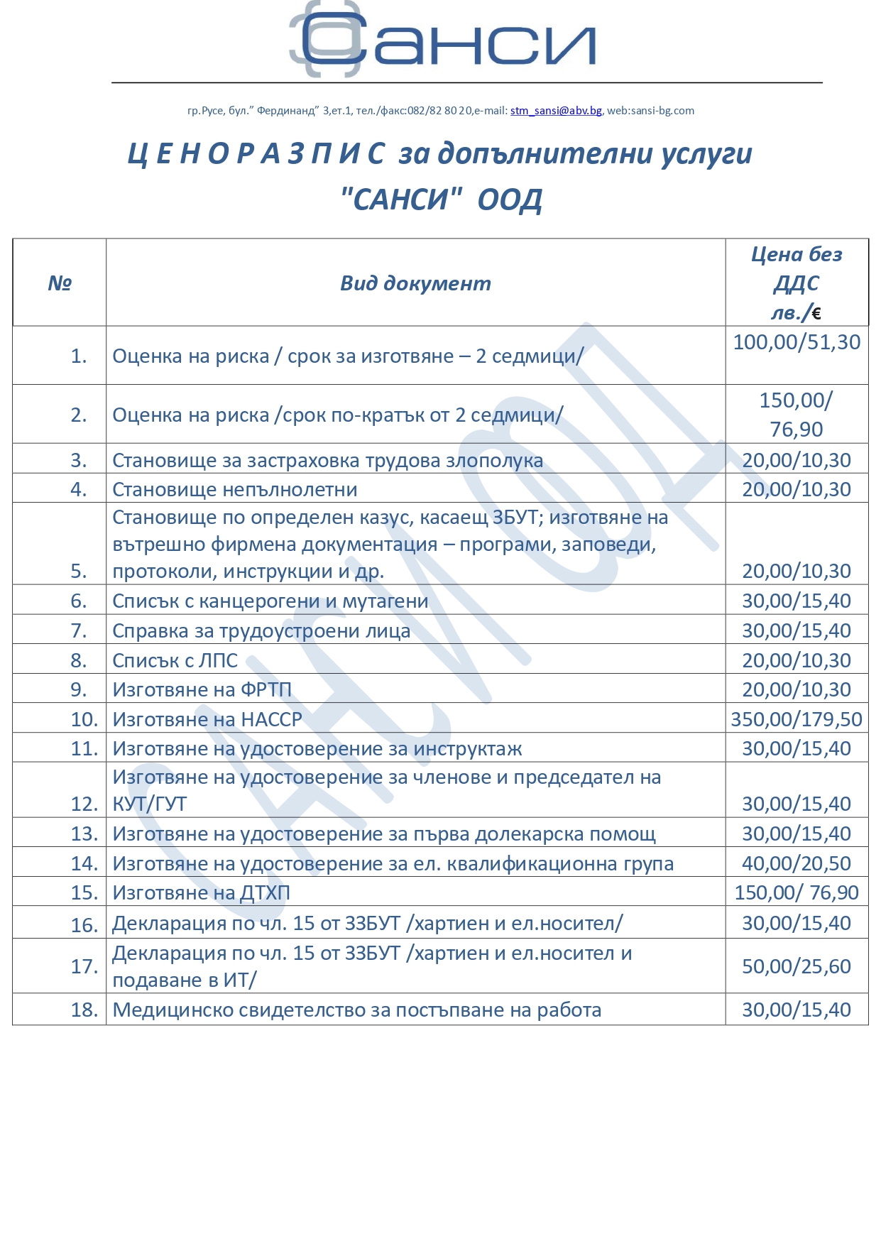 Ценоразпис ДейностиСлужба по трудова медицина Обслужване от СТМ Нашите услуги Политика по ЗБУТ и ОС Бланки документи ЗБУТ Нормативни документи ЗБУТ Сертификати ДДД услуги Наредби Списък с препарати Разрешителни от МЗ Орган за контрол Медицински център Обучение и проекти Ценоразпис